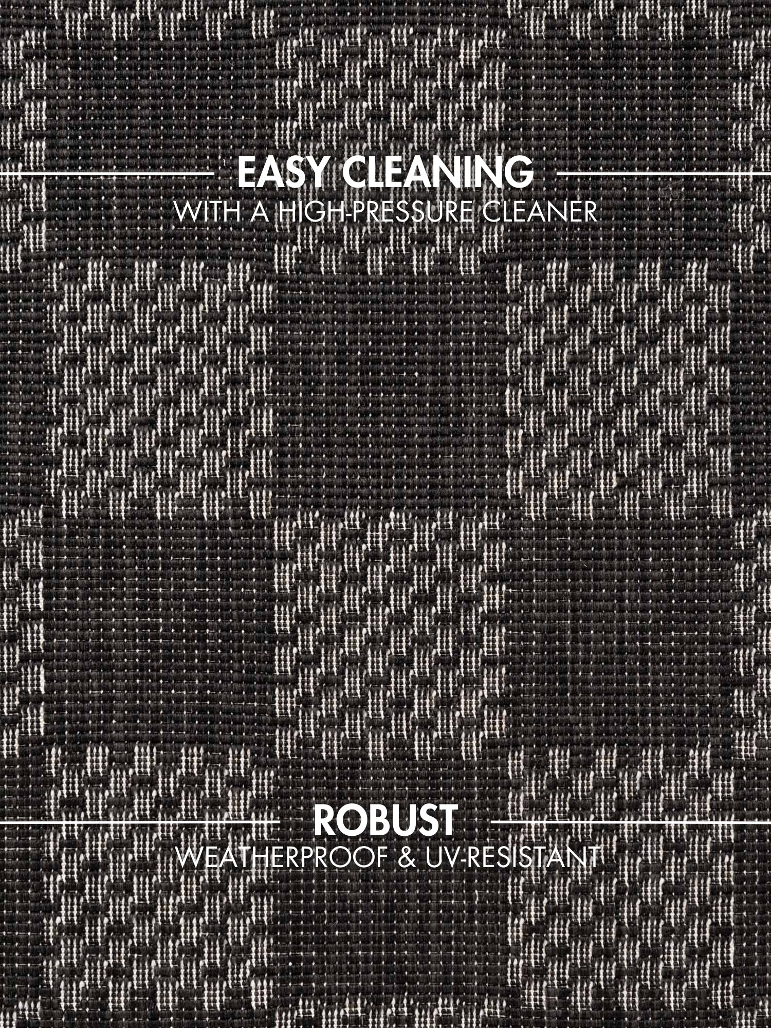 Den fladvævede struktur gør tæppet ideelt til rum med høj trafik såvel som til terrassen, altanen eller udestuen. Materialet er smudsafvisende og tåler daglig brug, samtidig med at tæppet er velegnet til gulvvarme ved indendørs anvendelse.