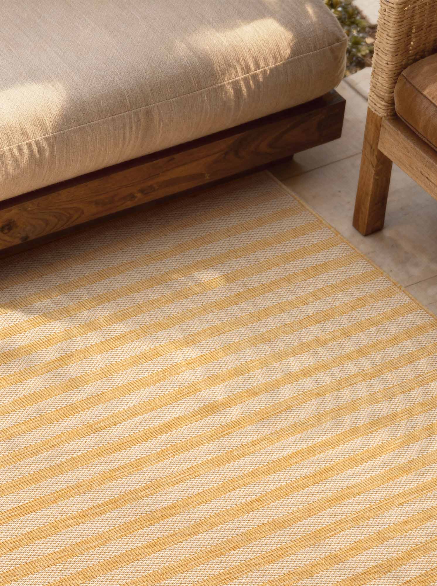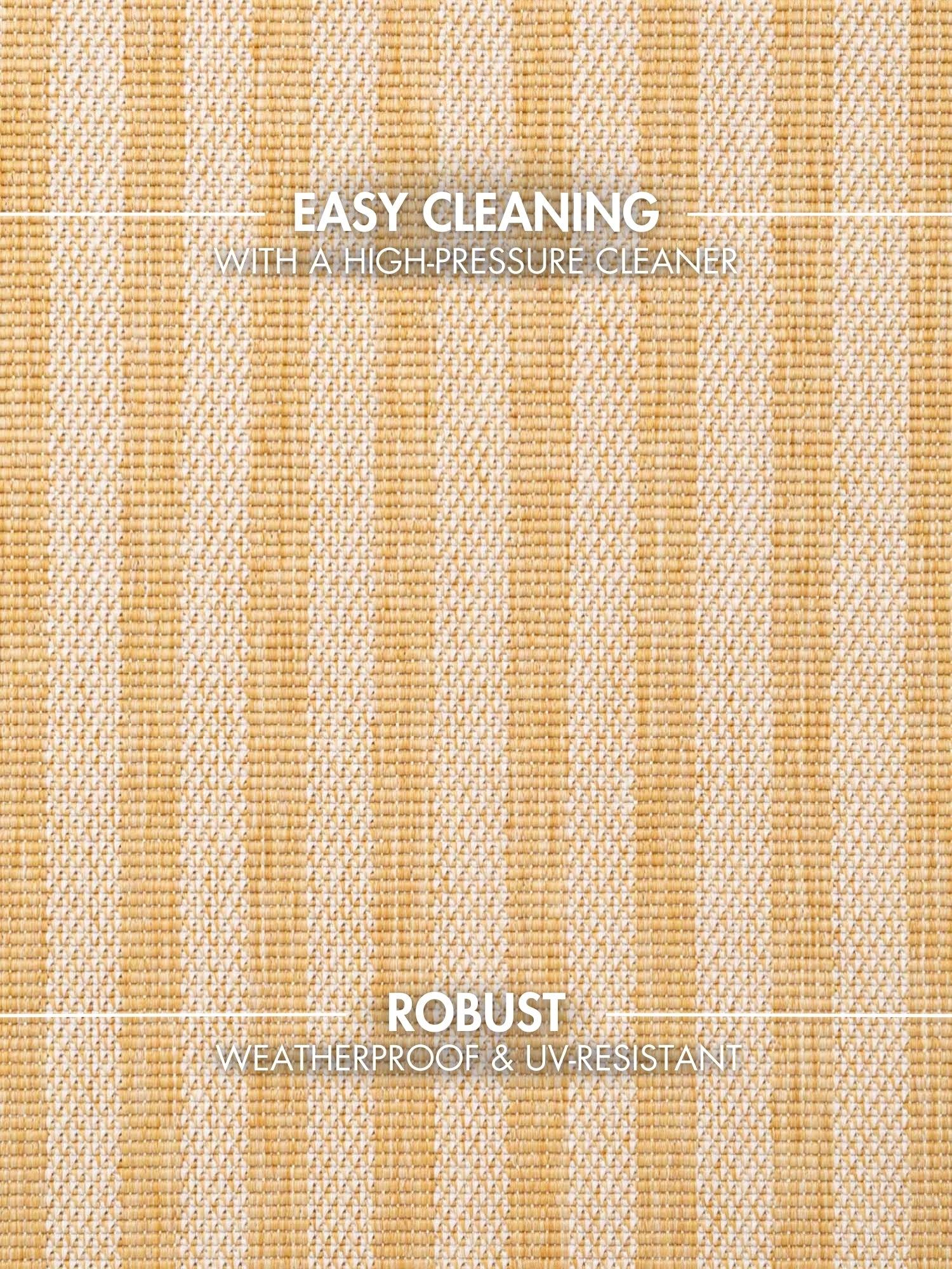 Den fladvævede struktur gør tæppet ideelt til rum med høj trafik såvel som til terrassen, altanen eller udestuen. Materialet er smudsafvisende og tåler daglig brug, samtidig med at tæppet er velegnet til gulvvarme ved indendørs anvendelse.