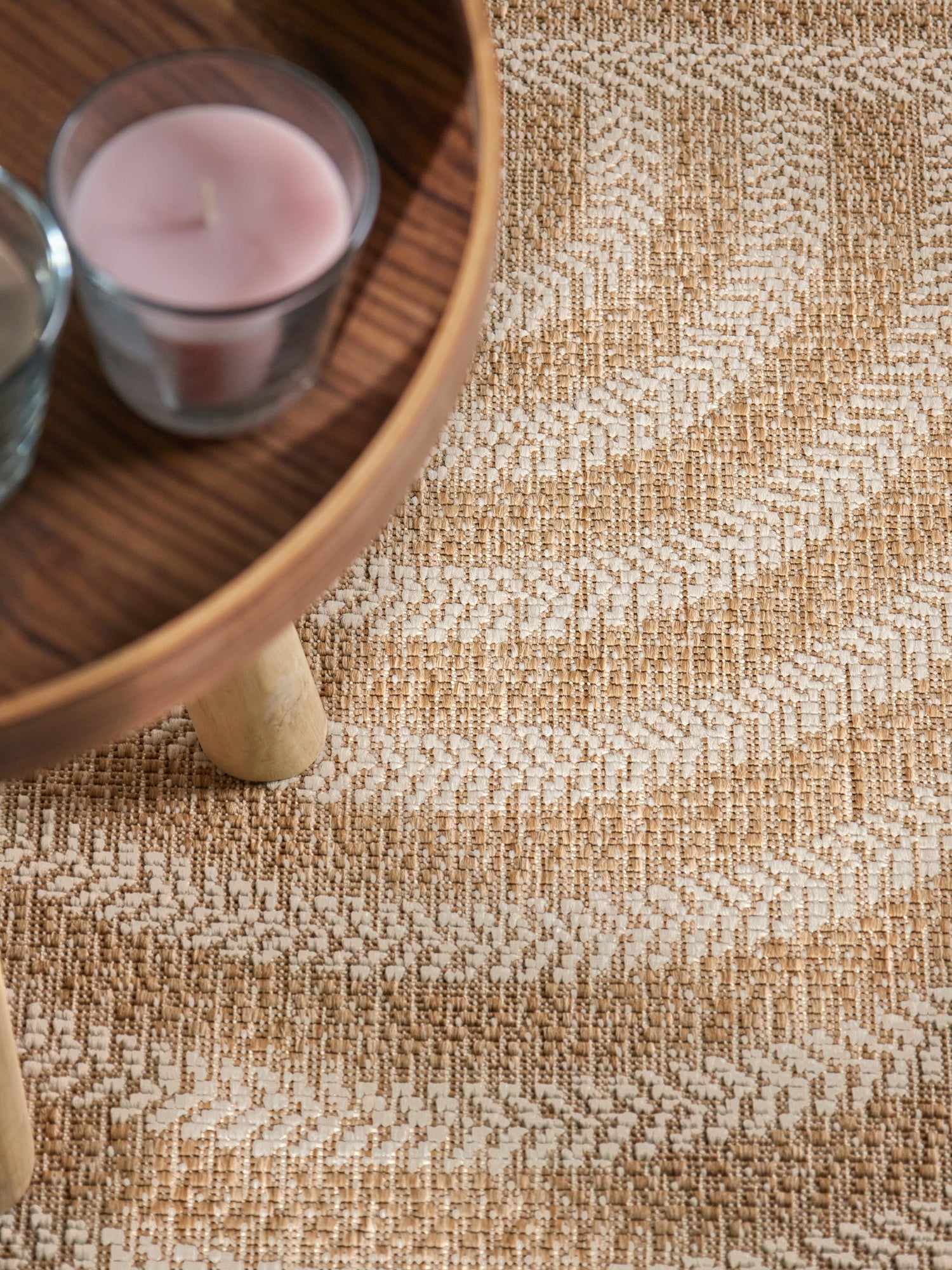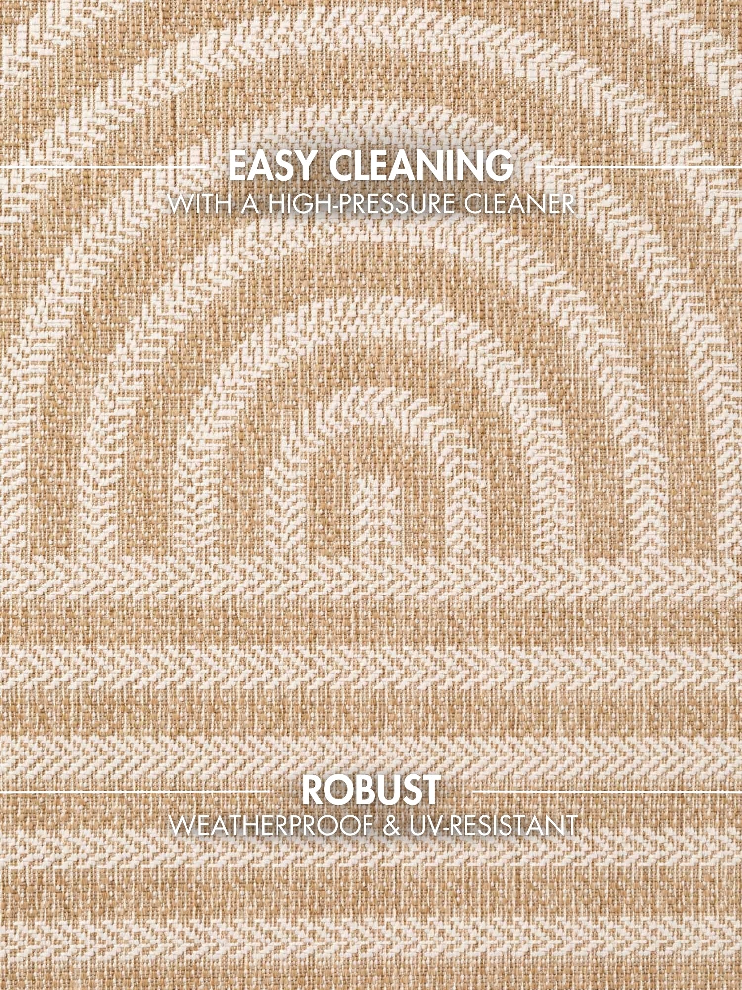 Den fladvævede struktur gør tæppet ideelt til rum med høj trafik såvel som til terrassen, altanen eller udestuen. Materialet er smudsafvisende og tåler daglig brug, samtidig med at tæppet er velegnet til gulvvarme ved indendørs anvendelse.