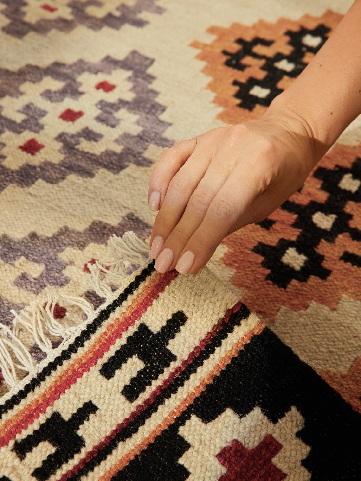 Tæppet er håndvævet af 80 % uld og 20 % bomuld, hvilket sikrer en robust og naturlig kvalitet. Den flade vævning med en luvhøjde på ca. 3 mm og de stærke frynser giver både komfort og lang holdbarhed – perfekt til dig, der ønsker et slidstærkt og bæredygtigt valg.