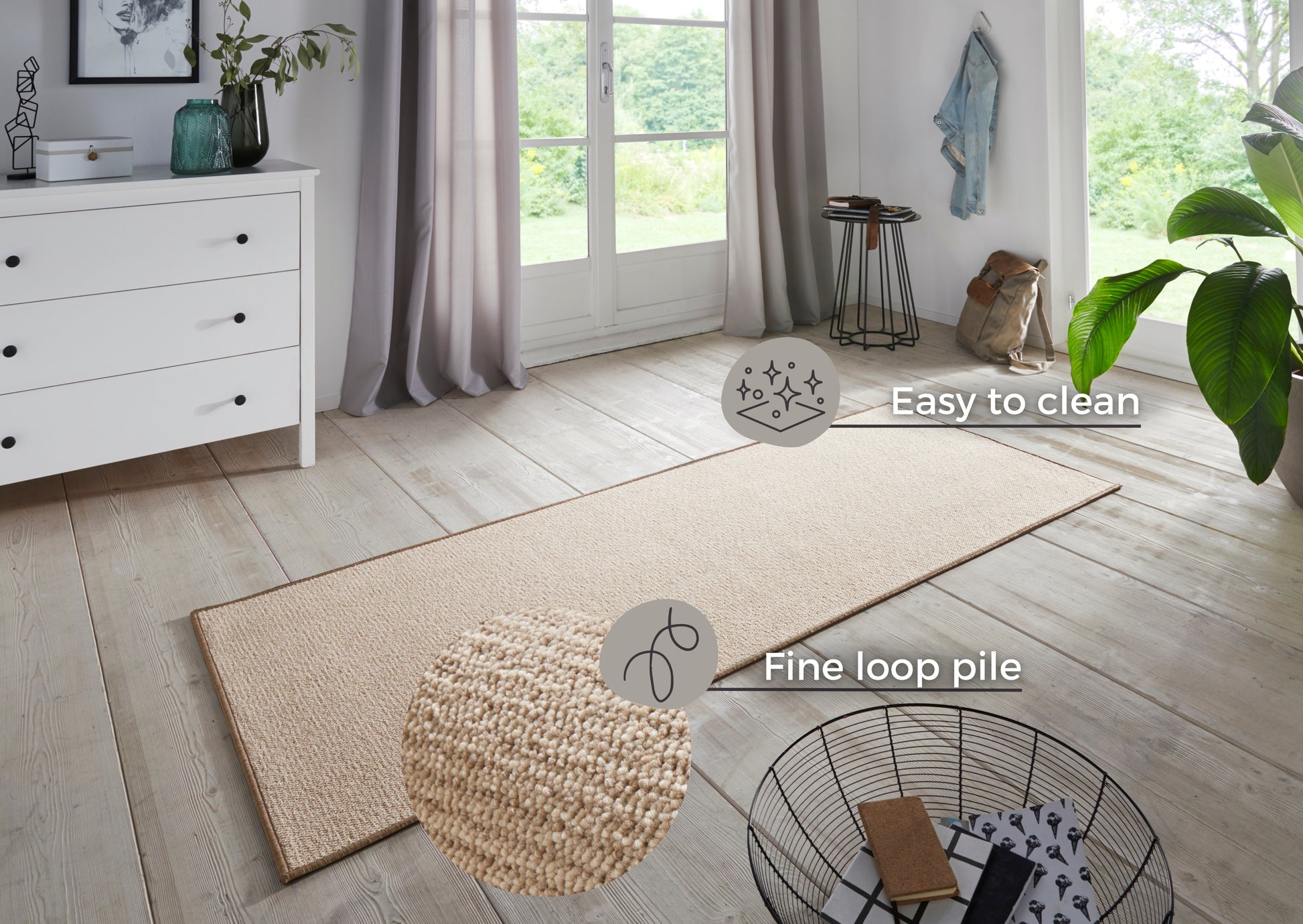 Boucle Tæppeløber fås i tre smukke farver og otte forskellige størrelser, så du kan vælge den, der passer perfekt til din indretning.