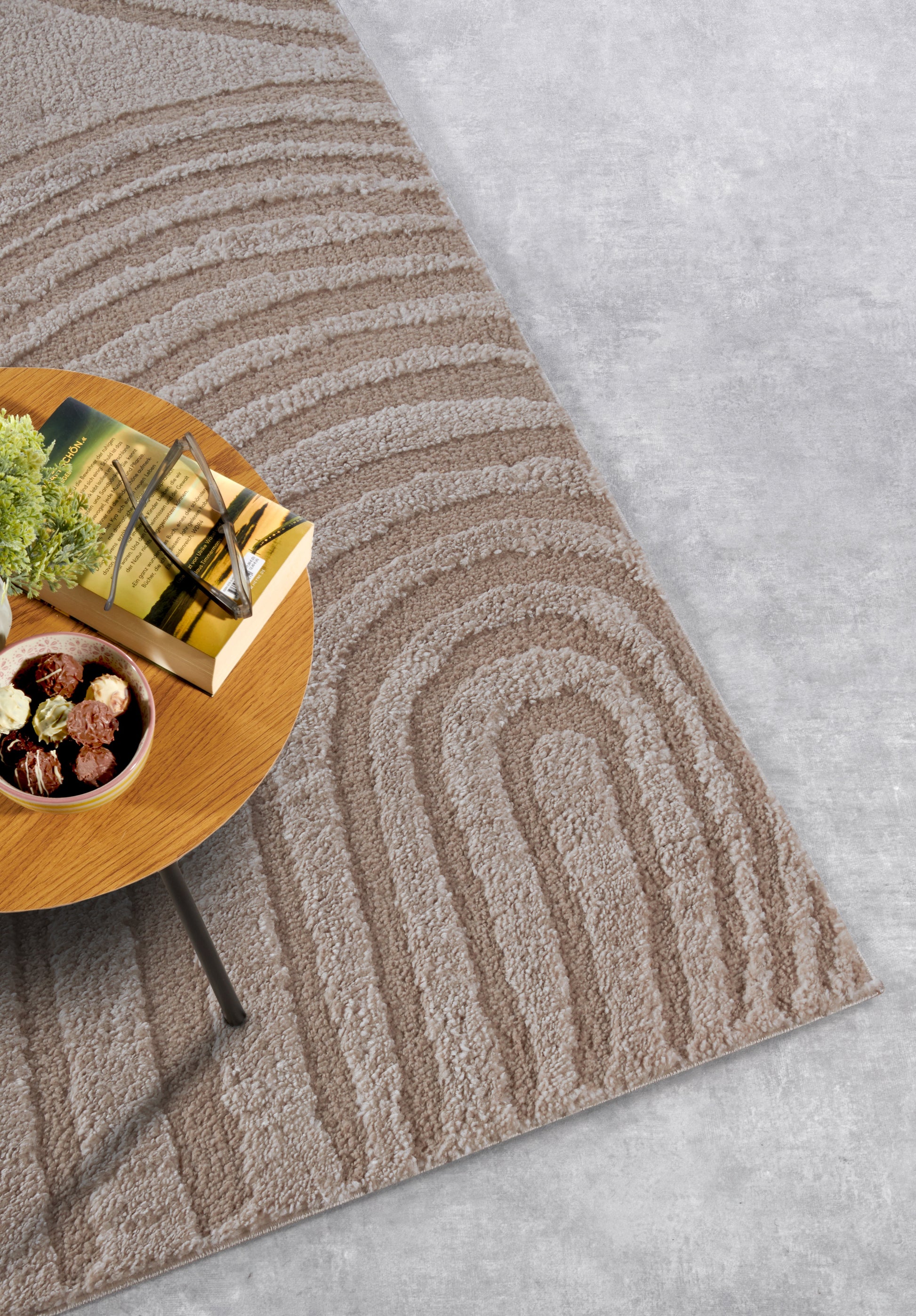 Den beige farve er varm og alsidig, hvilket gør det nemt at integrere tæppet i forskellige indretningsstile. Farven fungerer godt i både moderne og traditionelle omgivelser, og den tilføjer en subtil elegance til ethvert rum. Beige er en tidløs farve, der kan komplementere forskellige farveskemaer og møbler, hvilket gør det til en ideel base for ethvert interiørdesign.