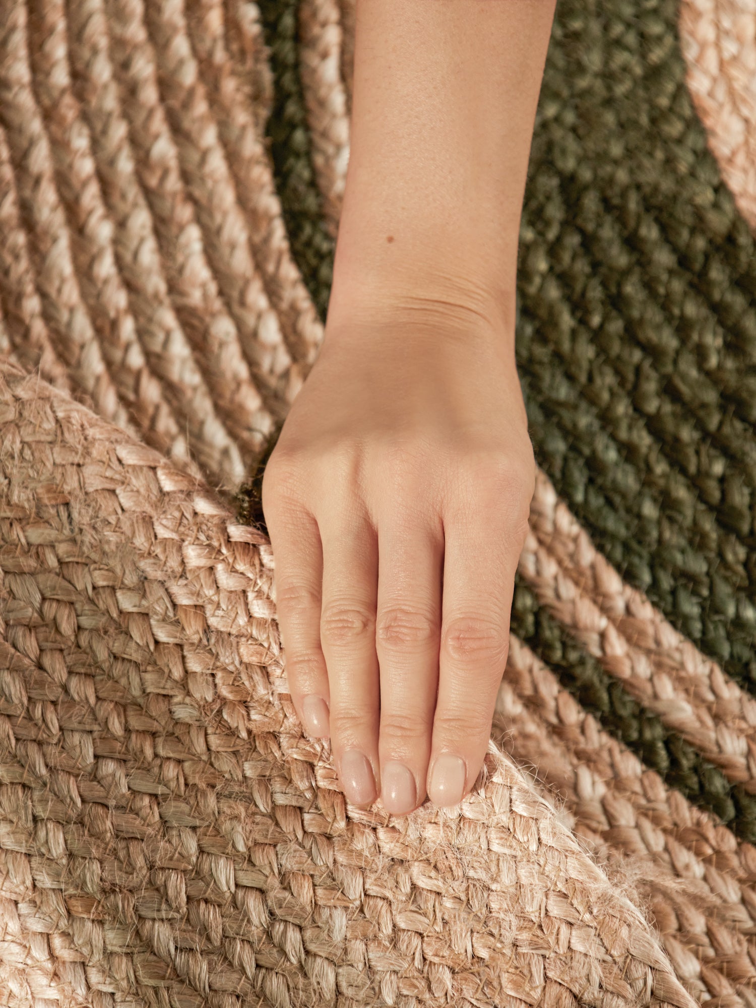 Tæppet er håndvævet i slidstærke jutefibre, hvilket betyder, at hvert tæppe er unikt med naturlige variationer i farve og struktur. Ved første brug kan der forekomme en let, naturlig duft, som hurtigt forsvinder.