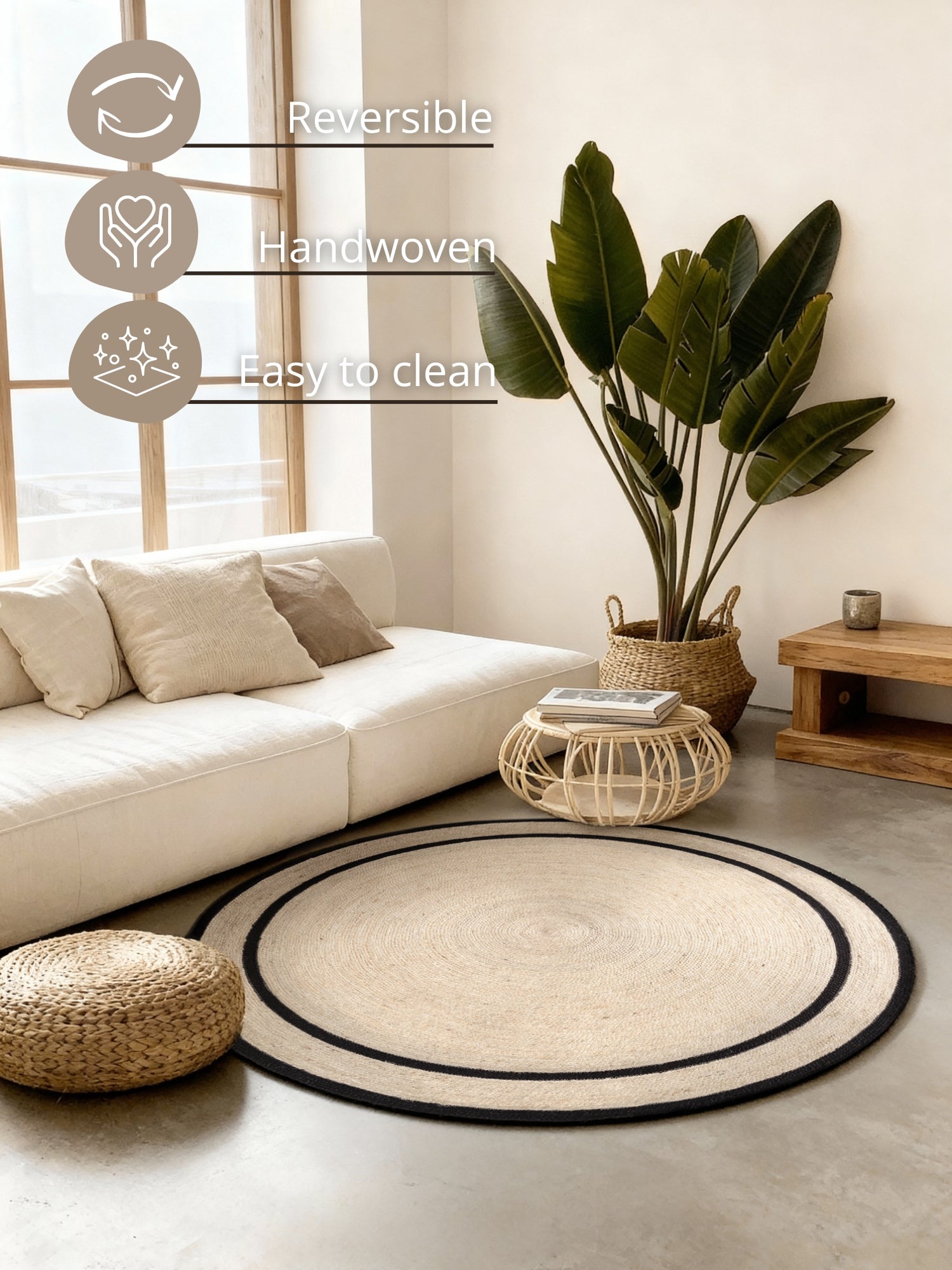 Dette runde, flettede jutetæppe udstråler tidløs elegance og tilfører indretningen et naturligt og harmonisk udtryk. Det stilrene design gør, at tæppet nemt kan falde diskret ind i rummet eller fungere som et smukt og iøjnefaldende element i indretningen. Den flettede struktur giver tæppet en charmerende, rustik karakter med klare referencer til den klassiske landstil.