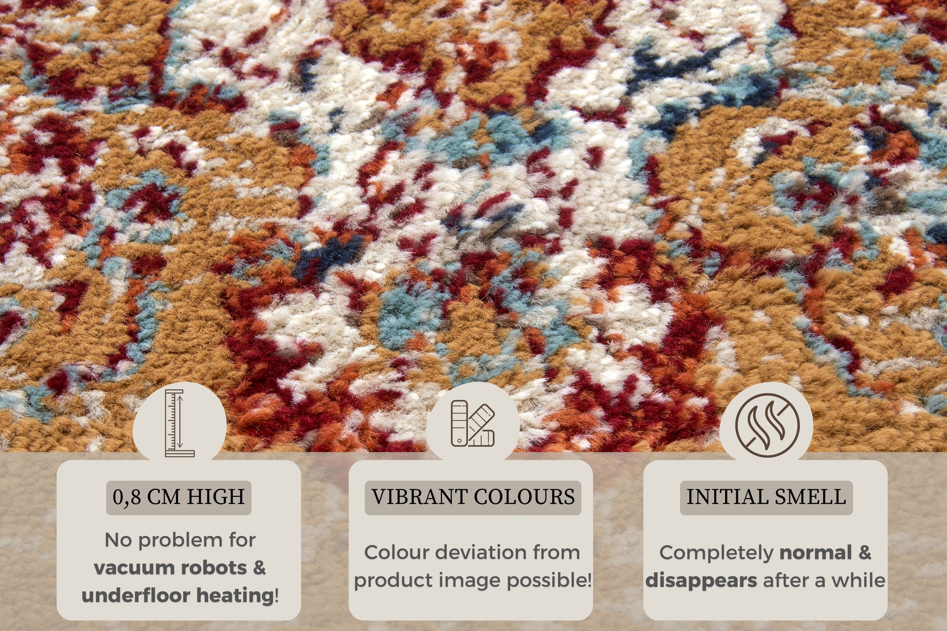Farvepaletten på dette tæppe er en symfoni af skønhed. De rige og dybe farver bringer varme og karakter til ethvert rum, og de er omhyggeligt kombineret for at skabe en visuel appel, der fanger opmærksomheden.