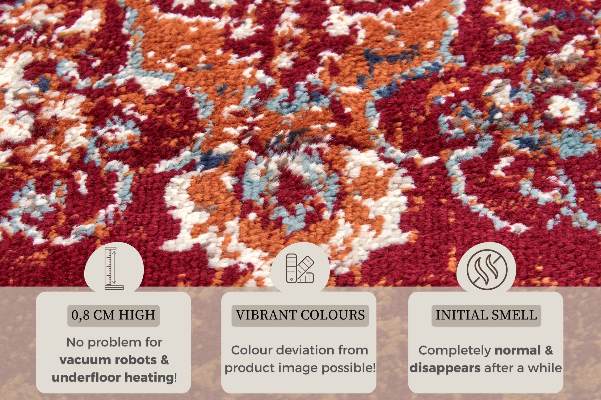 Farvepaletten på dette tæppe er en symfoni af skønhed. De rige og dybe farver bringer varme og karakter til ethvert rum, og de er omhyggeligt kombineret for at skabe en visuel appel, der fanger opmærksomheden.
