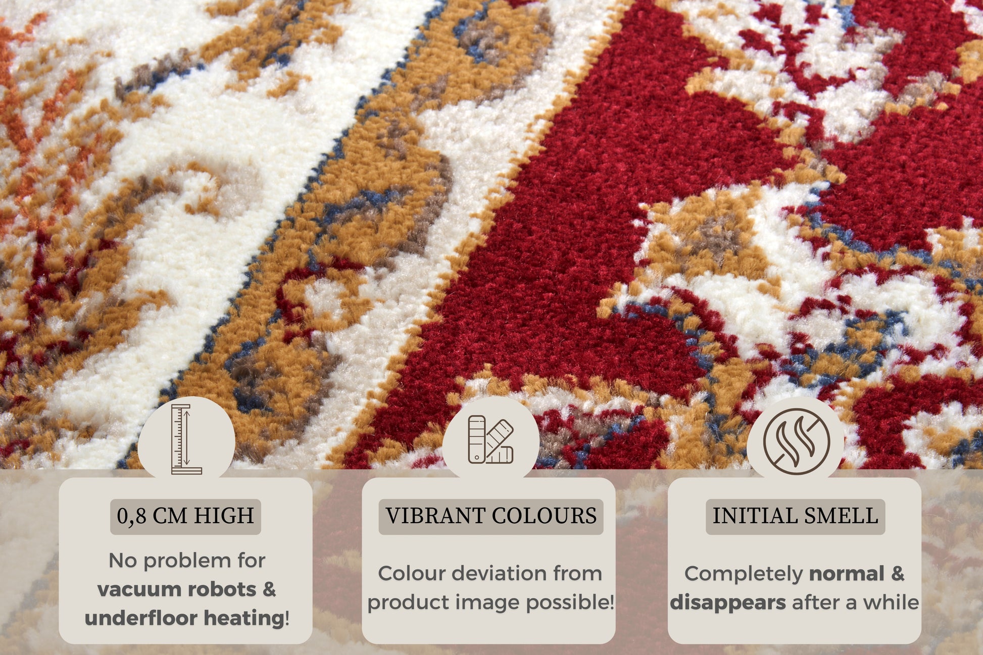 Orientalsk Tæppe Luxor repræsenterer en fusion af traditionel elegance og moderne bekvemmelighed. Tæppet er præget af detaljeret design og nøje udvalgte mønstre. Den avancerede maskinvævning sikrer en præcis gengivelse af komplekse detaljer, der skaber et kunstværk på gulvet.