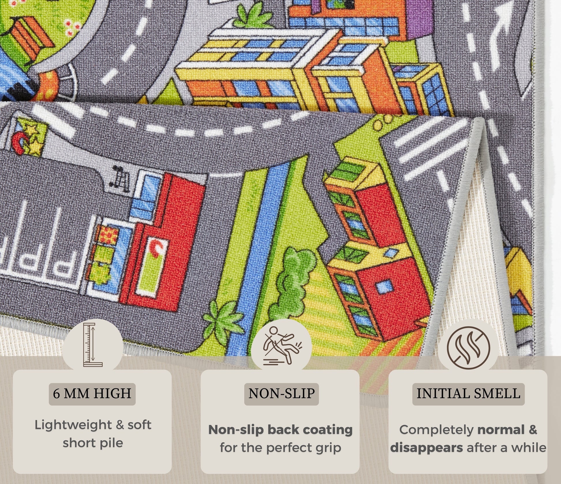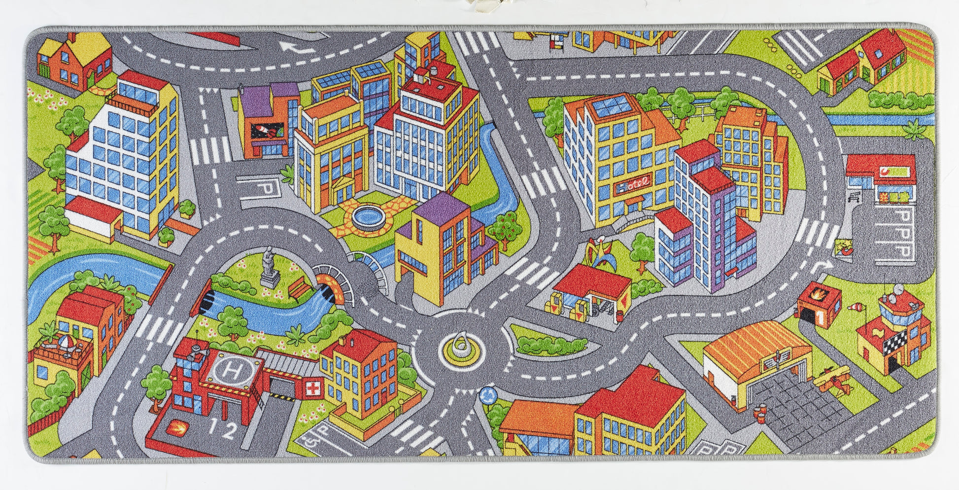 Tæppets design er farverigt og fantasifuldt, med mønstre og billeder, der tilskynder til legende udforskning og stimulerer barnets fantasi. Fremstillet af polyamid, tilbyder tæppet en holdbar løsning, der modstår slid og let kan rengøres, hvilket gør det velegnet til børneværelser og legeområder.