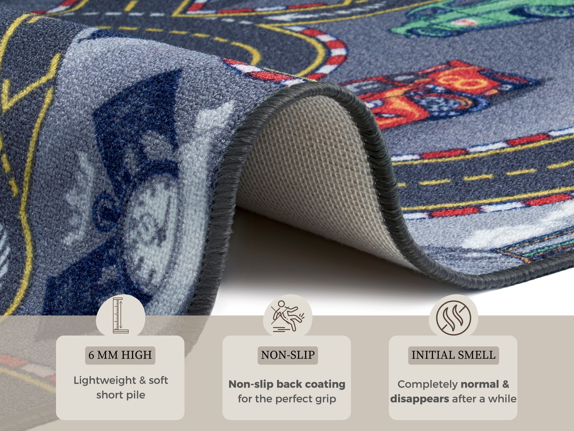 Tæppets design er farverigt og fantasifuldt, med mønstre og billeder, der tilskynder til legende udforskning og stimulerer barnets fantasi. Fremstillet af polyamid, tilbyder tæppet en holdbar løsning, der modstår slid og let kan rengøres, hvilket gør det velegnet til børneværelser og legeområder.