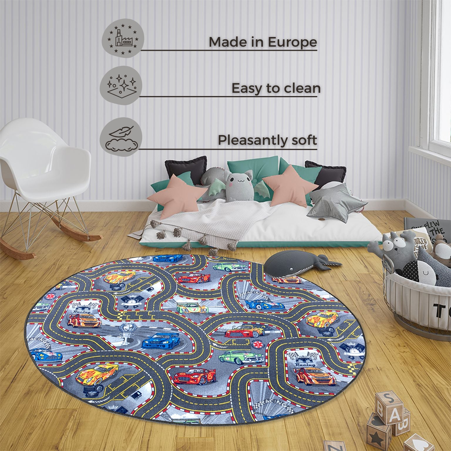 Introducerer Børnetæppe Play, det ideelle legetæppe skabt til at inspirere leg, kreativitet og komfort for de små. Dette tæppe er fremstillet af høj kvalitet polyamid, der kombinerer holdbarhed med en blød og luksuriøs følelse, perfekt til børns leg og hvile.