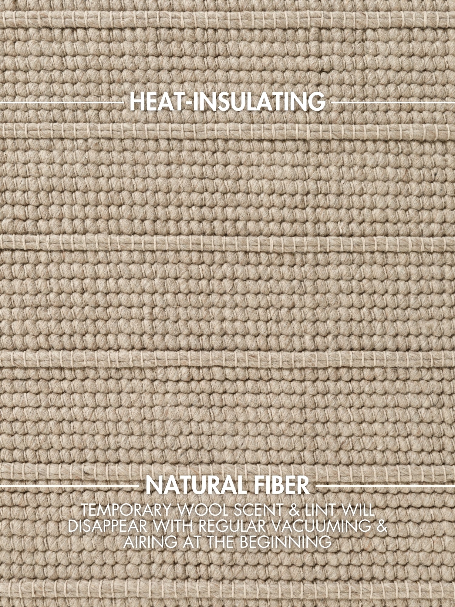Uldens naturlige egenskaber gør tæppet slidstærkt og behageligt at gå på, samtidig med at materialet er relativt nemt at vedligeholde. Som med mange uldtæpper kan der i starten forekomme let fældning og en naturlig duft fra ulden – dette aftager med tiden og er et tegn på materialets ægthed.