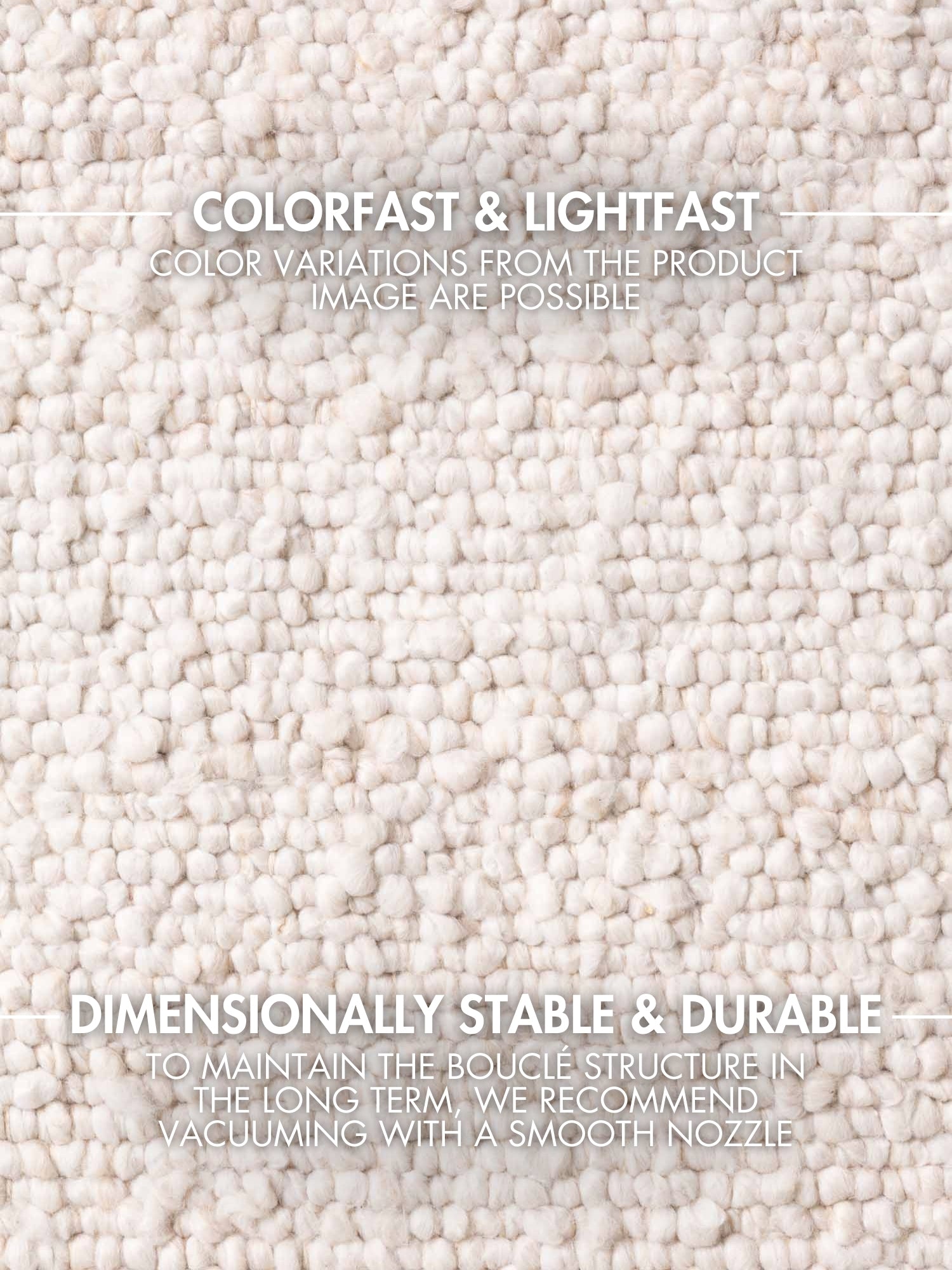 For at sikre tæppets holdbarhed anbefales skånsom støvsugning med glat mundstykke uden børste.