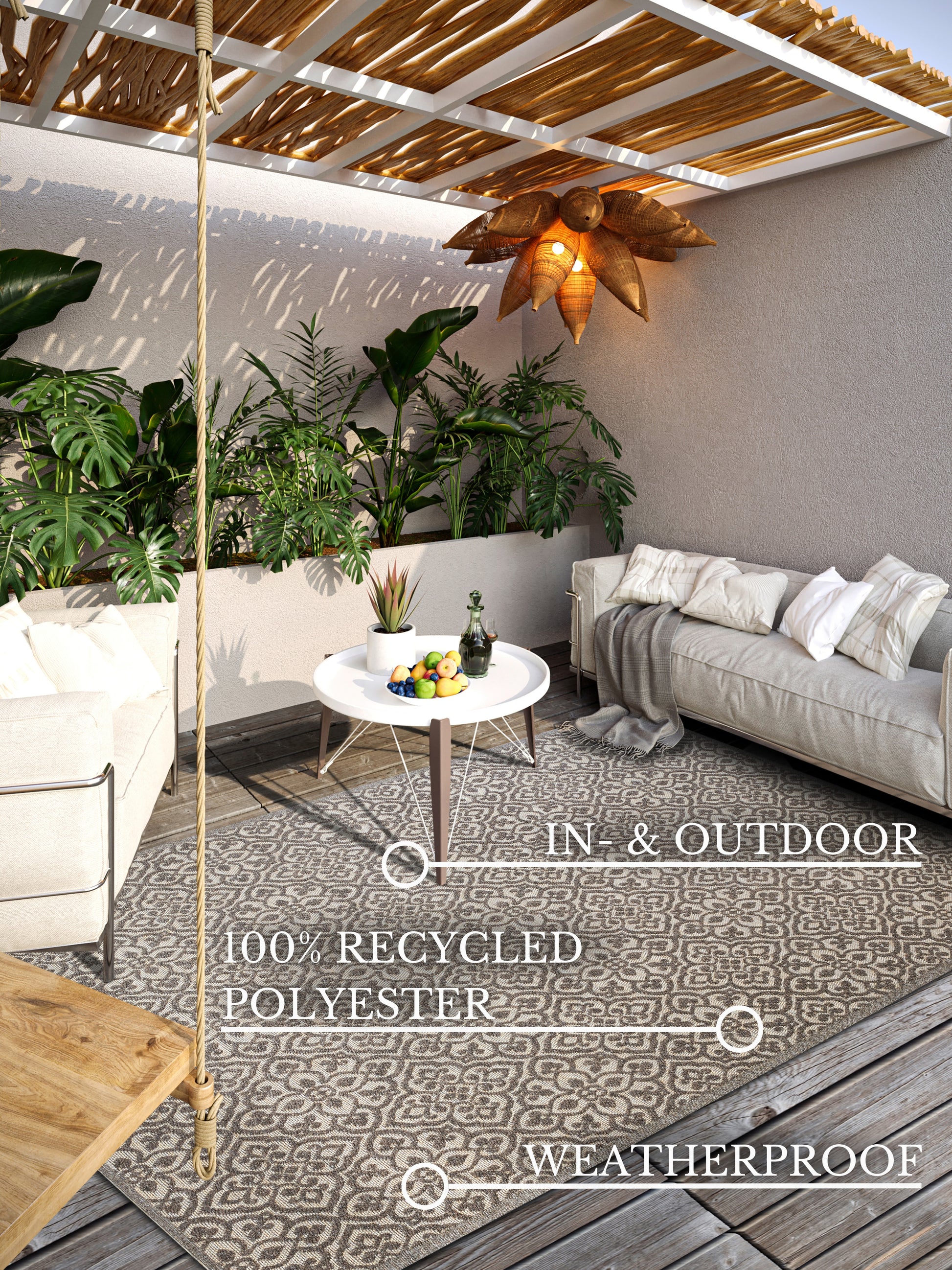 Dette tæppe er ideelt til terrasser, altaner, stuer eller andre områder, hvor du ønsker et strejf af luksus og funktionalitet. Med et tidløst design og forskellige farvemuligheder kan det nemt integreres i enhver indretningsstil. Det er UV-bestandigt og modstandsdygtigt over for fugt, hvilket gør det perfekt til udendørs brug, samtidig med at det opretholder sin skønhed og struktur.