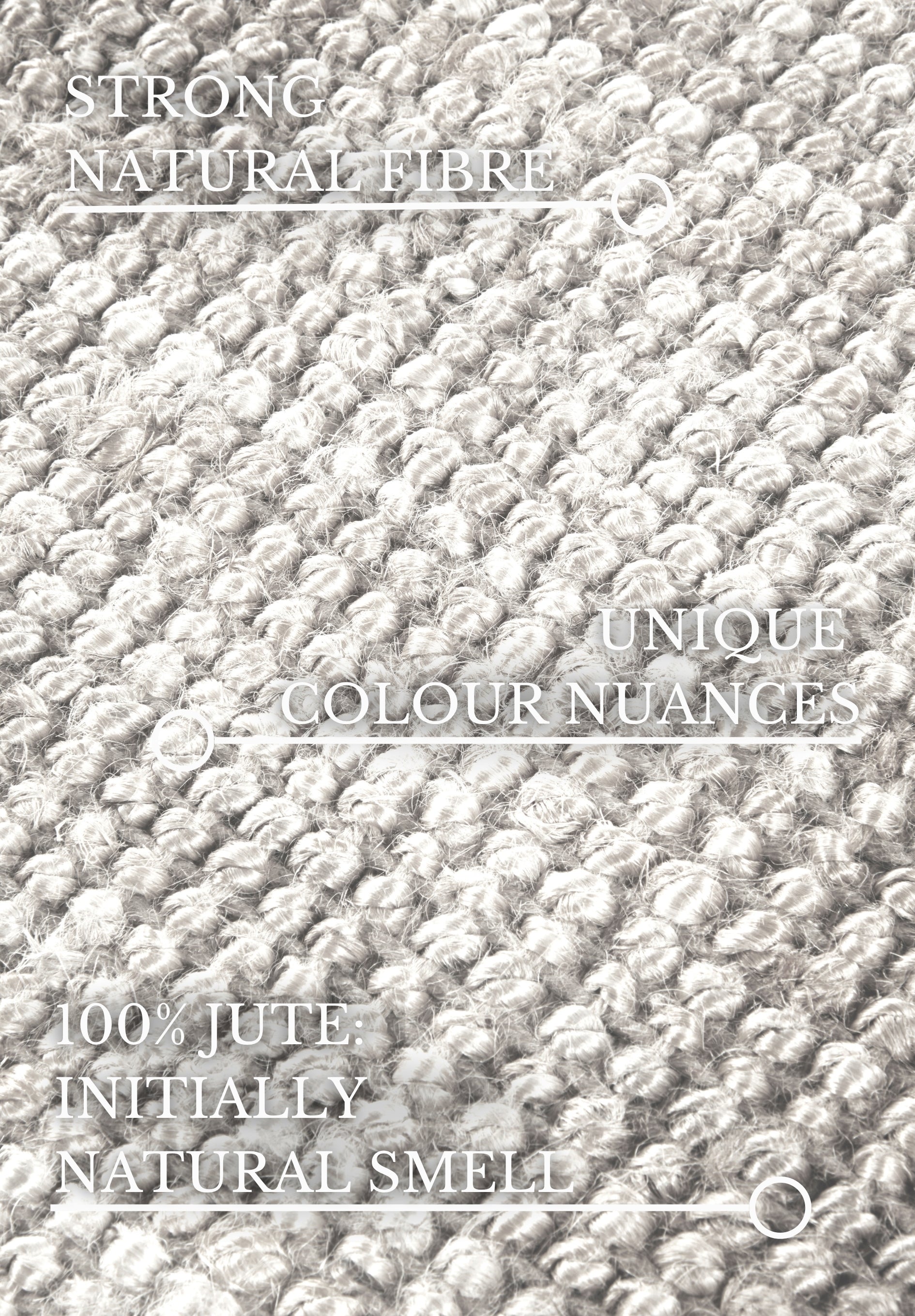 Tæppet er fremstillet i slidstærke, naturlige jutefibre og kendetegnes ved sin høje kvalitet og holdbarhed. Det er nemt at vedligeholde og kan let bankes eller støvsuges. Da tæppet er lavet af et naturmateriale, kan der forekomme mindre farvevariationer samt en let, naturlig duft ved første brug, som hurtigt aftager.