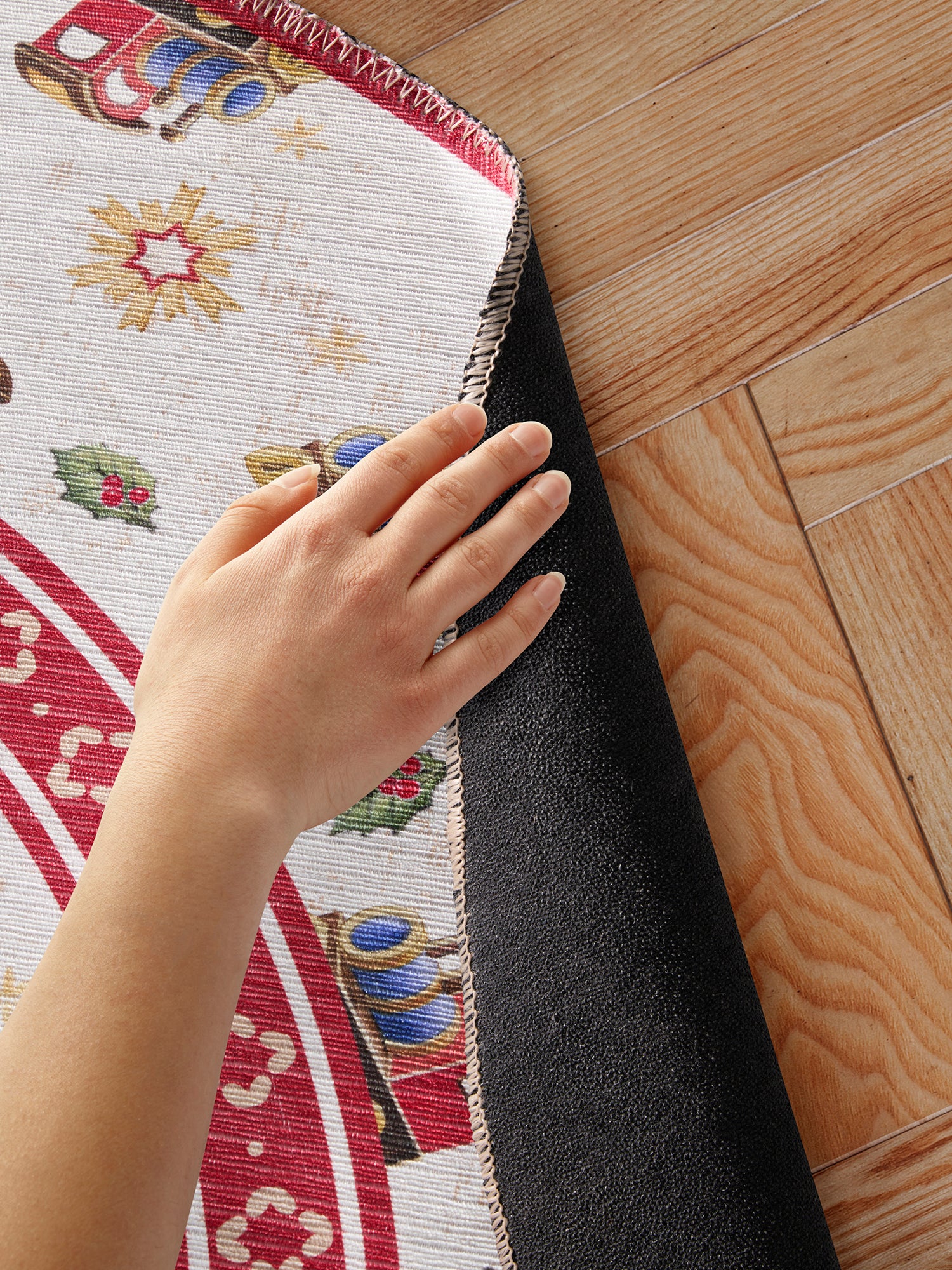 Dette juletæppe er fremstillet i bløde og slidstærke polyesterfibre, som giver en luksuriøs, fløjlsagtig overflade og gør tæppet nemt at rengøre i hånden. Den skridsikre PVC-struktur på bagsiden sikrer, at tæppet ligger fast – perfekt til livlige juledage og leg under træet.