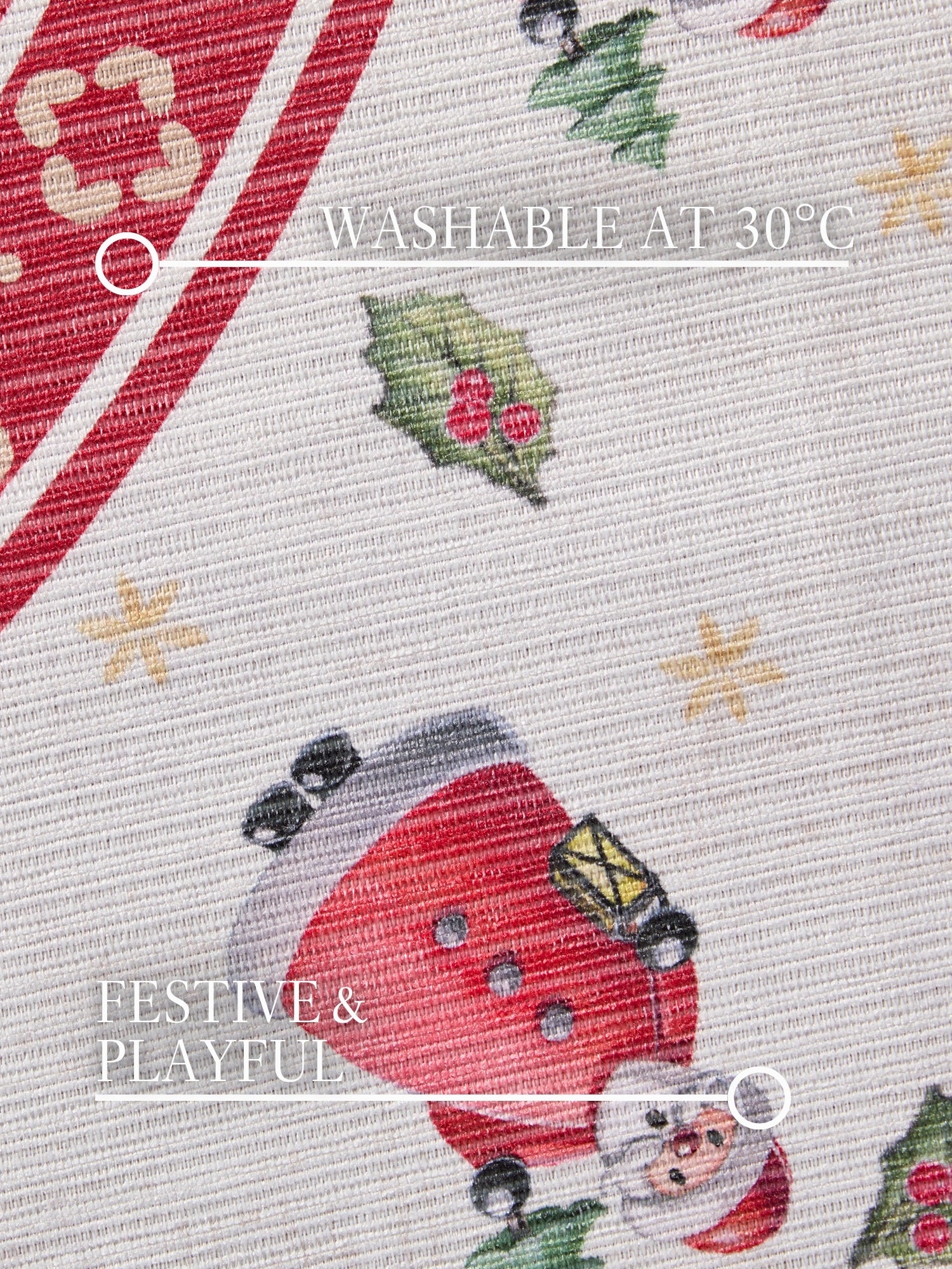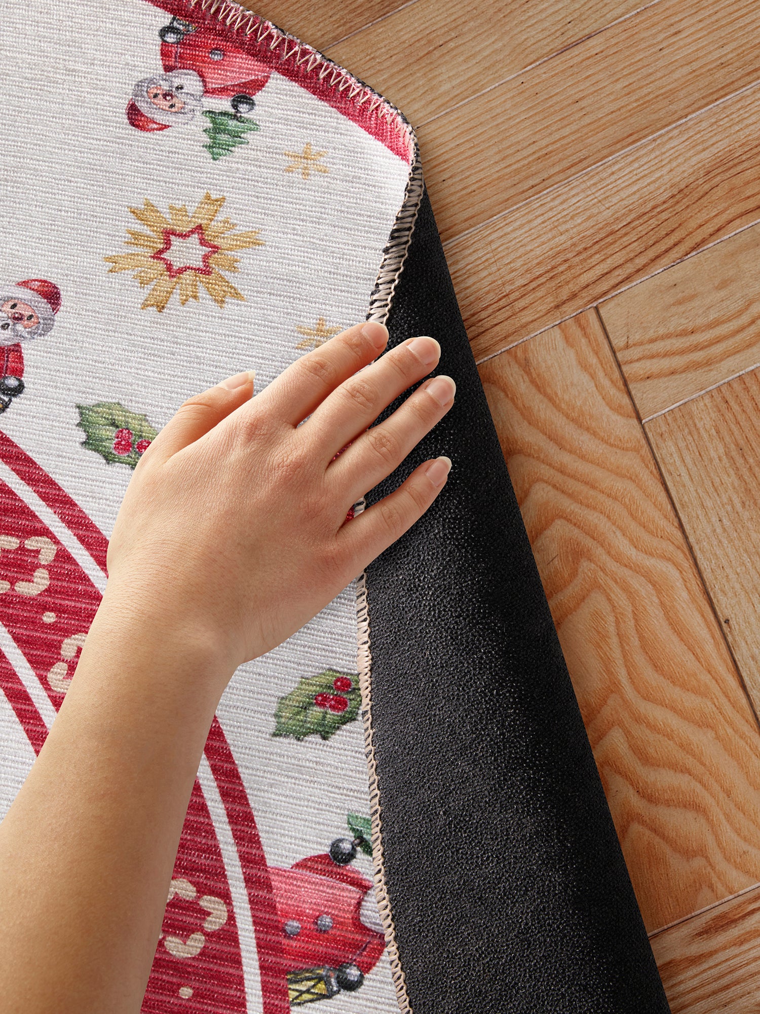 Dette juletæppe er fremstillet i bløde og slidstærke polyesterfibre, som giver en luksuriøs, fløjlsagtig overflade og gør tæppet nemt at rengøre i hånden. Den skridsikre PVC-struktur på bagsiden sikrer, at tæppet ligger fast – perfekt til livlige juledage og leg under træet.