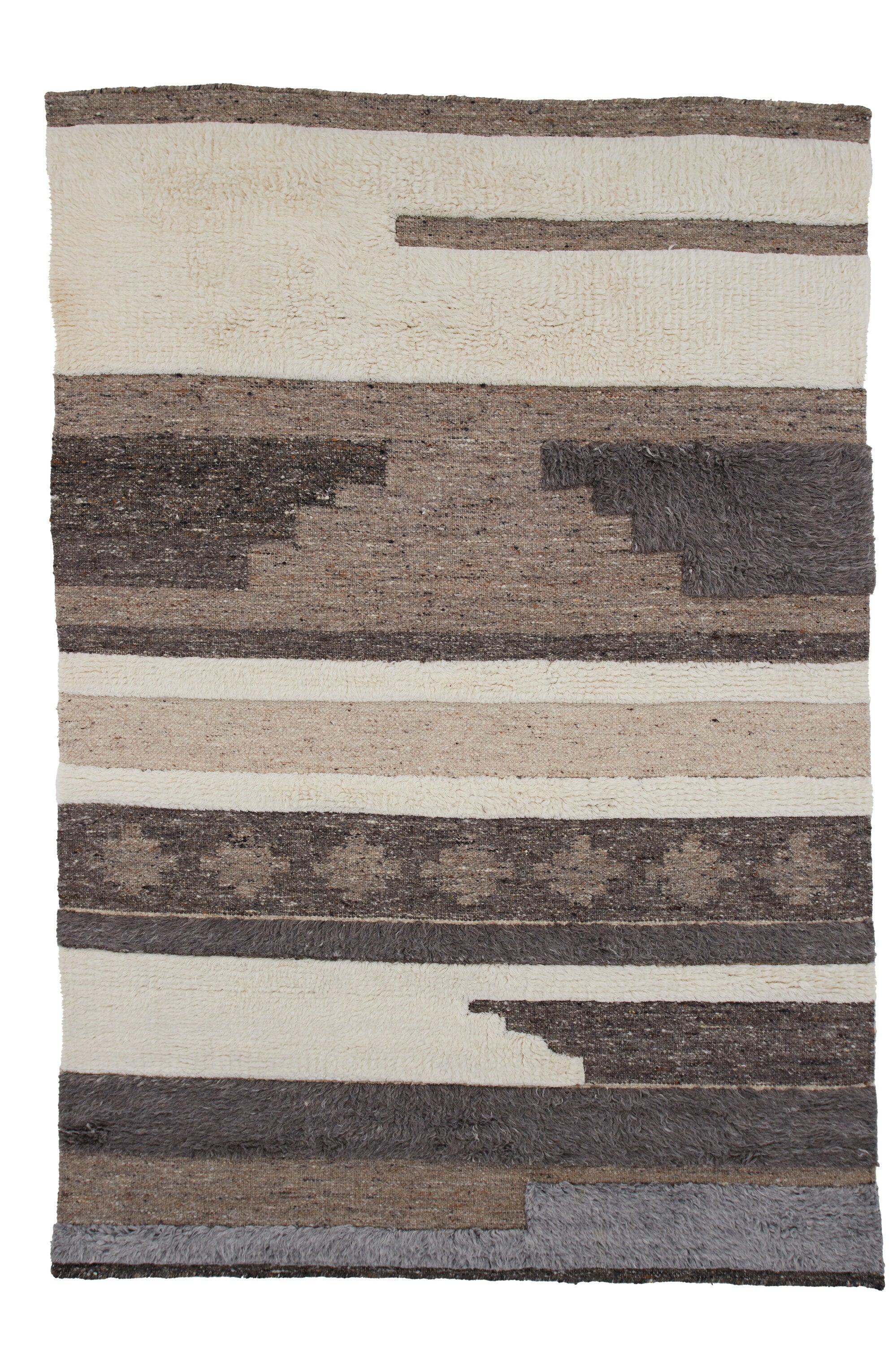 De varierede væveteknikker skaber smukke teksturer og dybde i overfladen, hvilket giver tæppet et levende og sofistikeret udtryk. Det passer perfekt under sofabordet, i soveværelset eller som et varmt og indbydende element i stuen.